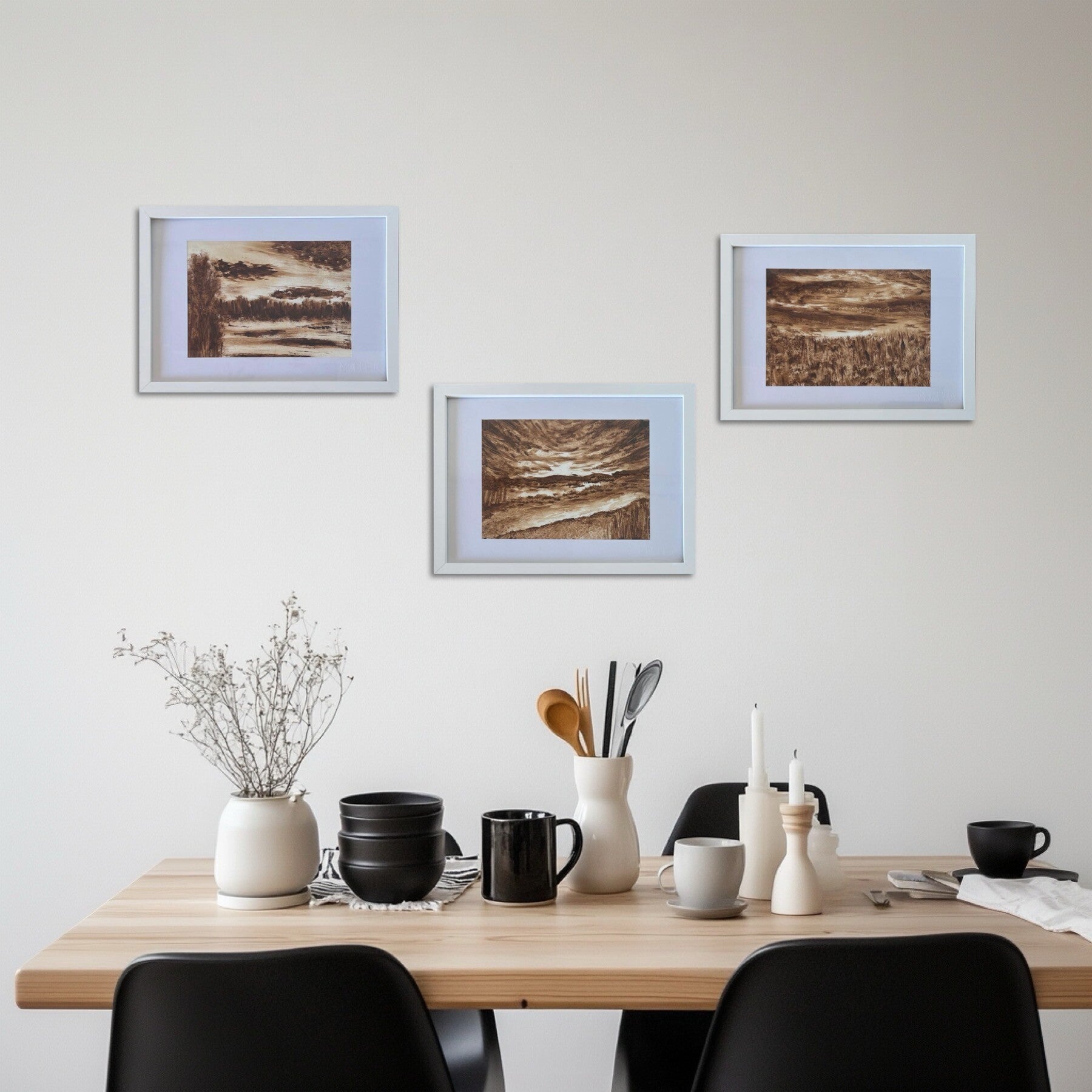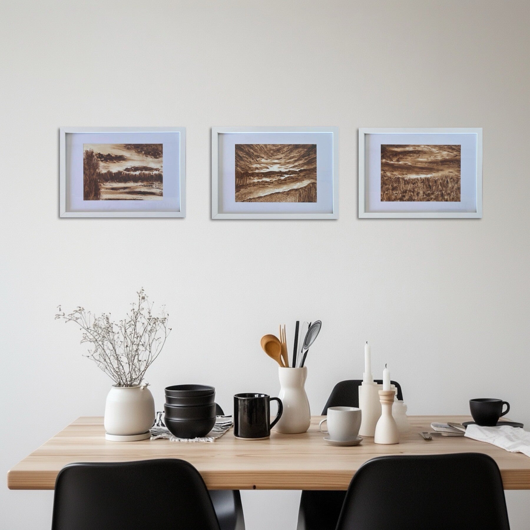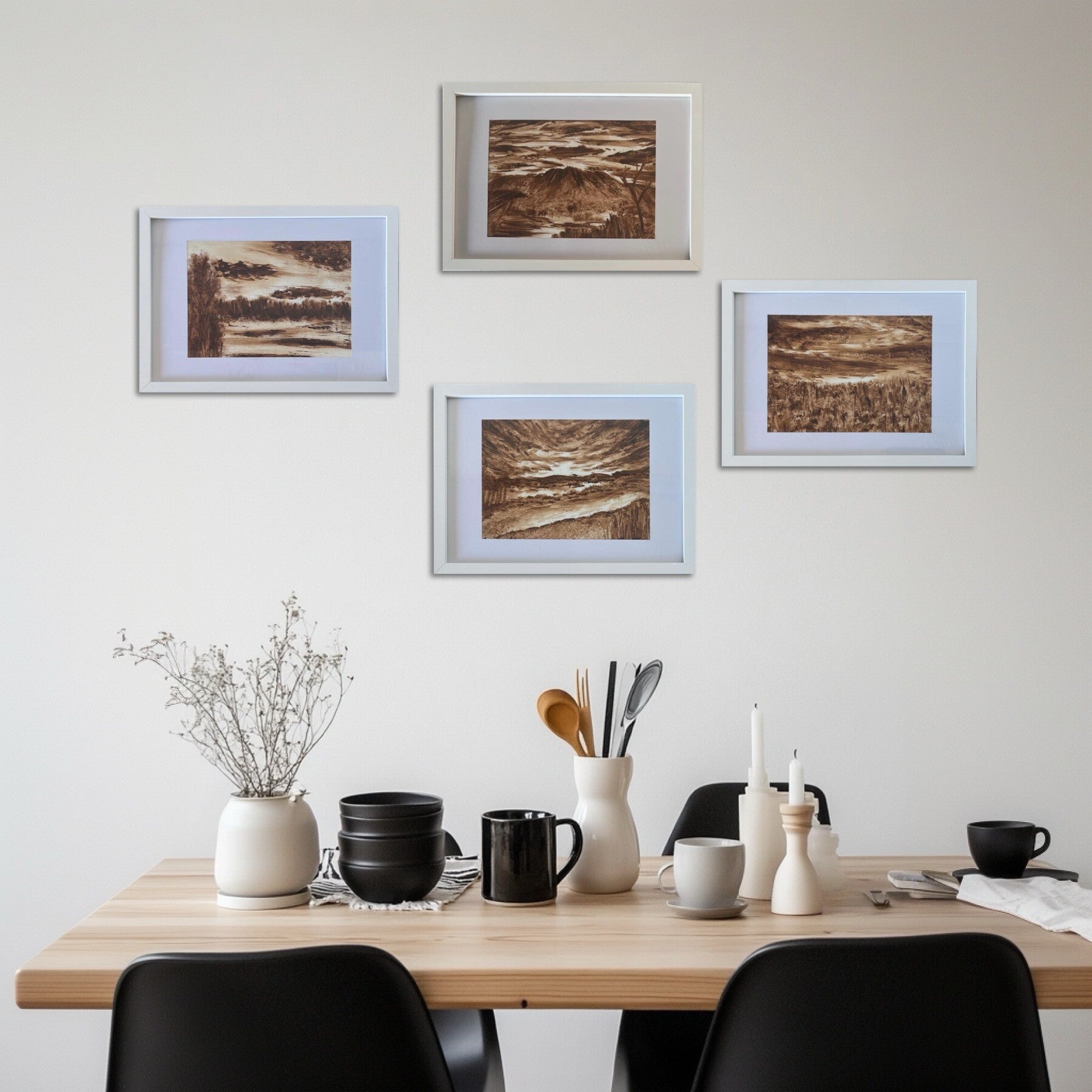 Les quatre premiers paysages sont réalisés dans une seule teinte, la terre d’ombre naturelle, tandis que les quatre suivants se distinguent par une plus grande variété de couleurs. On y retrouve différentes nuances d’ocre jaune, d’ocre rouge, de terre d’ombre brûlée et de terre d’ombre naturelle, créant une harmonie riche et nuancée.